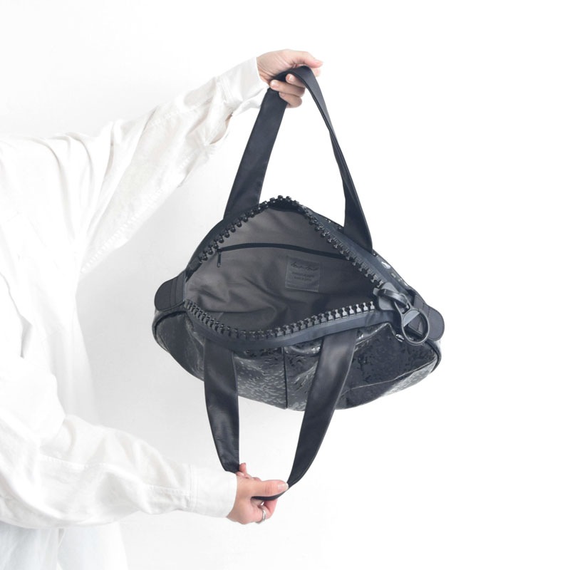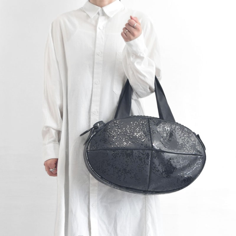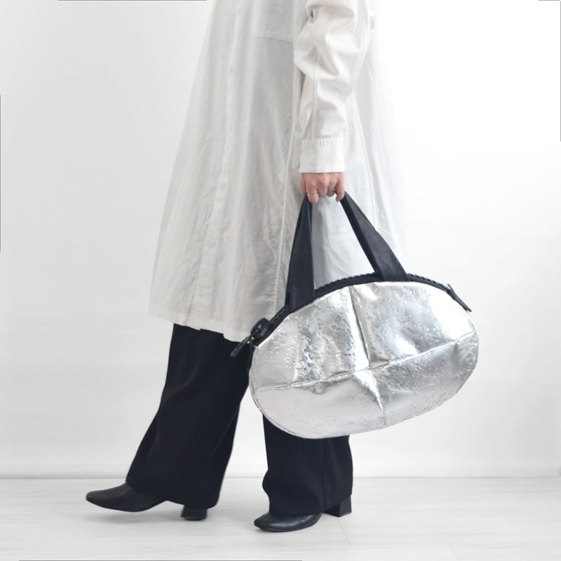 ブランド創設時から続く工業用ビッグファスナー(25bis)を使用した、楕円形状のユニークなレザートートバッグ。