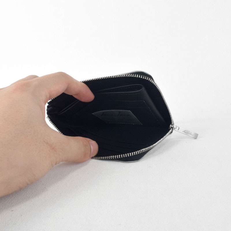 小銭入れはファスナーを使わずに出し入れでき、外側のファスナーを閉じることで小銭がこぼれない安心設計です。