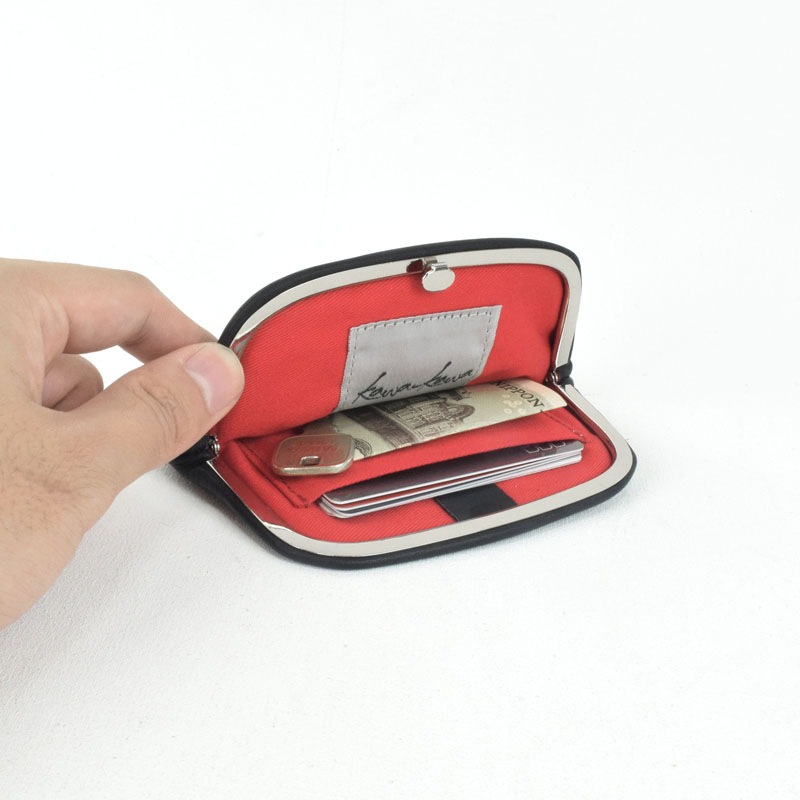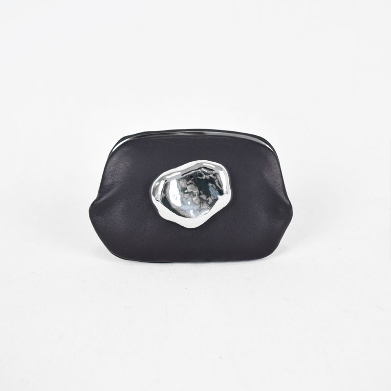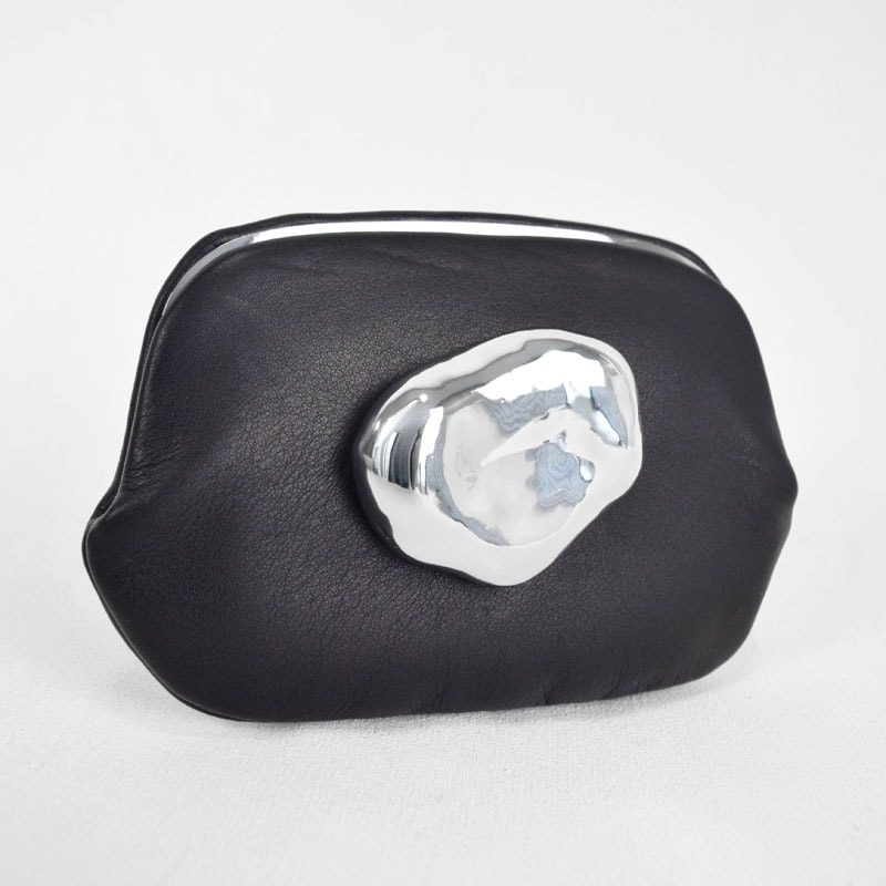 「石ころ」を思わせるオリジナルのメタルパーツが印象的なコンパクトな「口金ミニ財布」です。