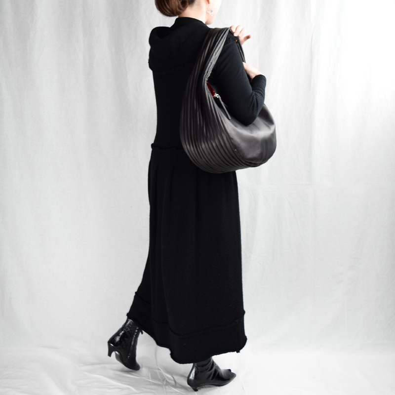 荷物の量に合わせて自然にシルエットが変化し、マチ一体型のショルダーは肩にやさしくフィット。