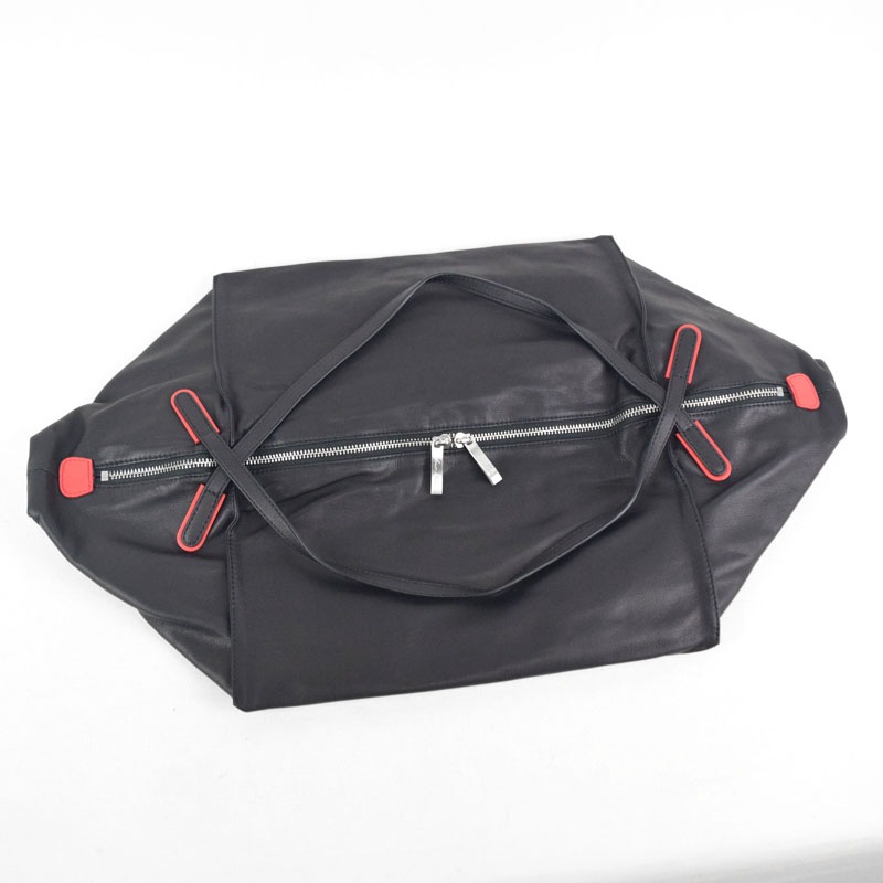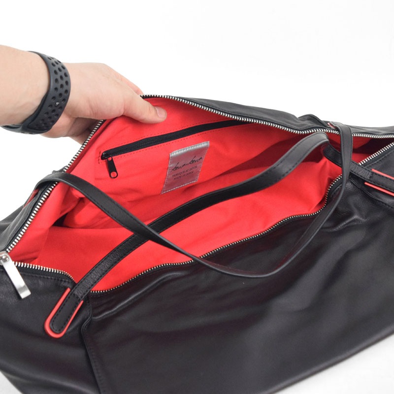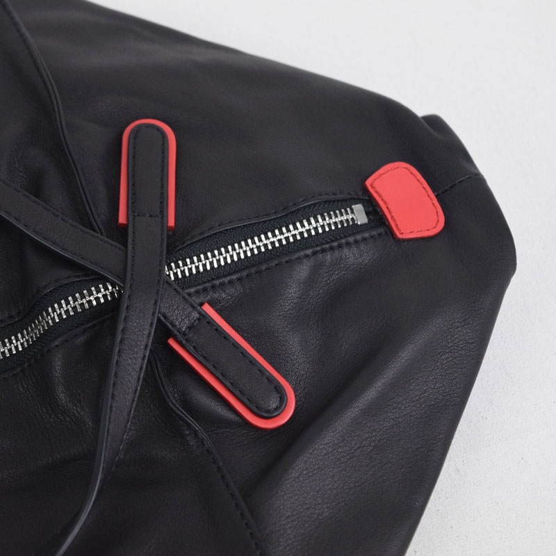 開口部のファスナーはダブルスライダーでどちらの肩に掛けても開けやすい仕様で、ハンドル付根とファスナーエンド部のアクセント配色もデザインポイントです。