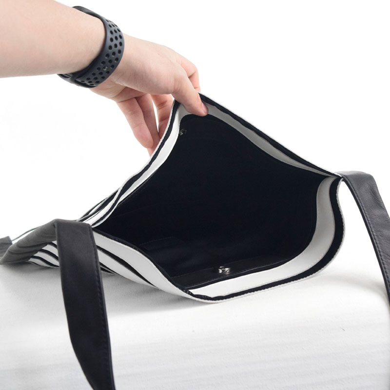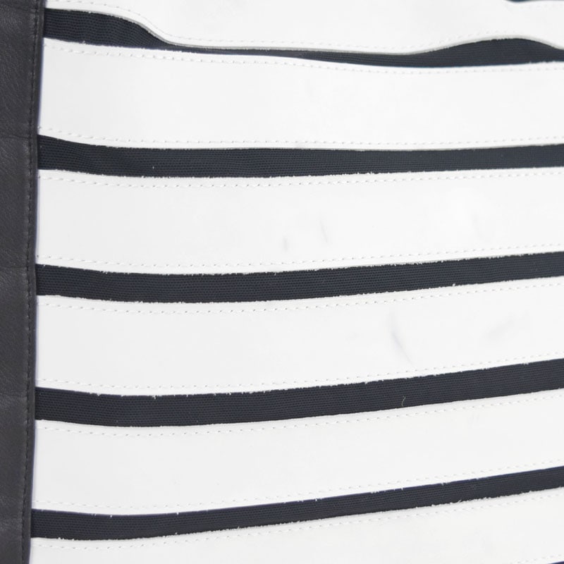 軽量で伸縮性に富んだネット素材に、つや消しホワイトレザーを、一枚一枚縫い付けボーダー柄を表現しています。